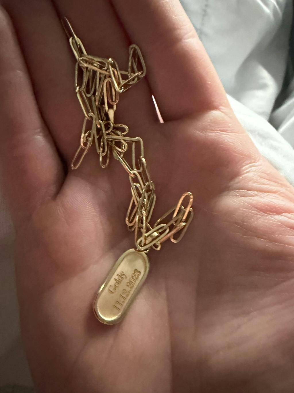 The Golden Tag's matte center is your personal canvas. Engrave it with a name, initials, a date, or a memory you want to hold close. Its smooth, elongated silhouette offers a timeless look that feels both modern and deeply sentimental.
